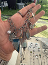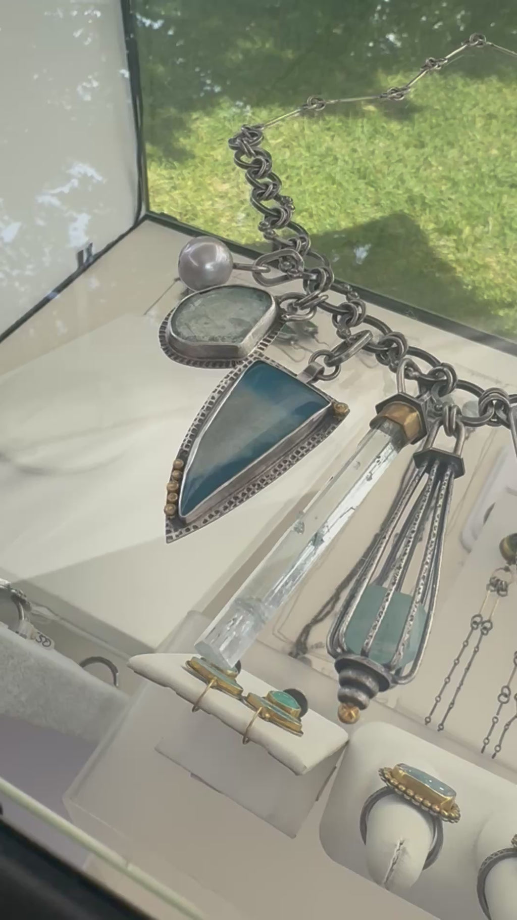 A bold statement of elemental beauty, this fringe-style necklace features seven one-of-a-kind charms suspended from a handmade sterling silver chain with 22k gold accents. Each charm—silver pearl, aquamarine slice, dumortierite, long aquamarine crystal, caged aquamarine, gilalite, and geode—brings its own texture and tone. Rustic, raw, and undeniably luxurious.