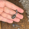 A luminous oval cabochon of shimmery black moonstone, glowing with subtle flashes of light. Set in a hand-stamped sterling silver setting and framed with a rich 22k gold bezel, this charm brings depth, mystery, and movement to any layered necklace.